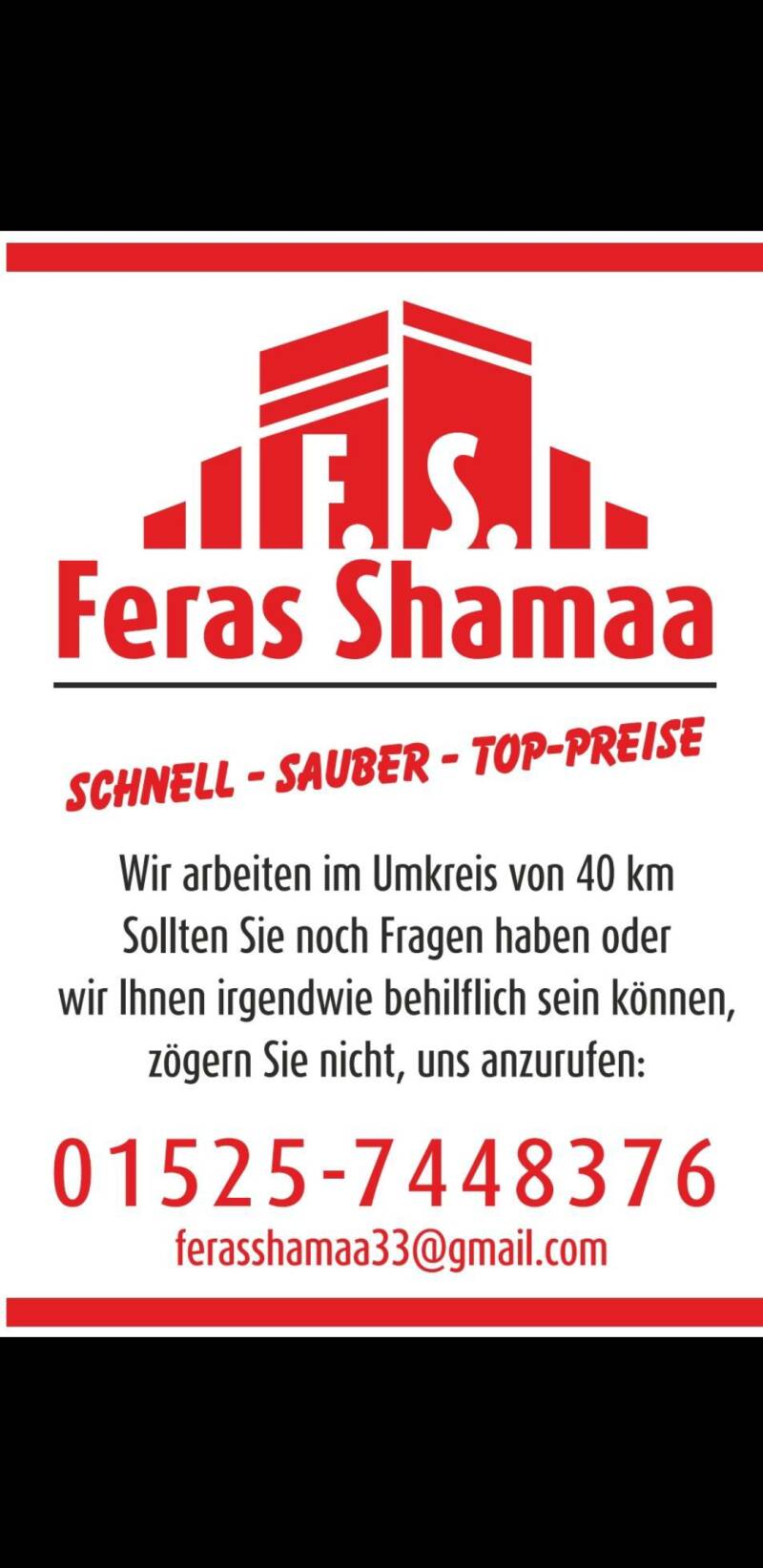 Ich empfehle diese gute Firma. Sehr faire Preise und schöne und saubere Arbeit. Feras ist eine höfliche, ehrliche und zuverlässige Person, die in meinem Haus viele professionelle Dinge erledigt hat. Er ist sehr erfahren und seine Arbeit ist sauber. Ich freue mich darauf, wieder mit ihnen zusammenzuarbeiten.❤️👍